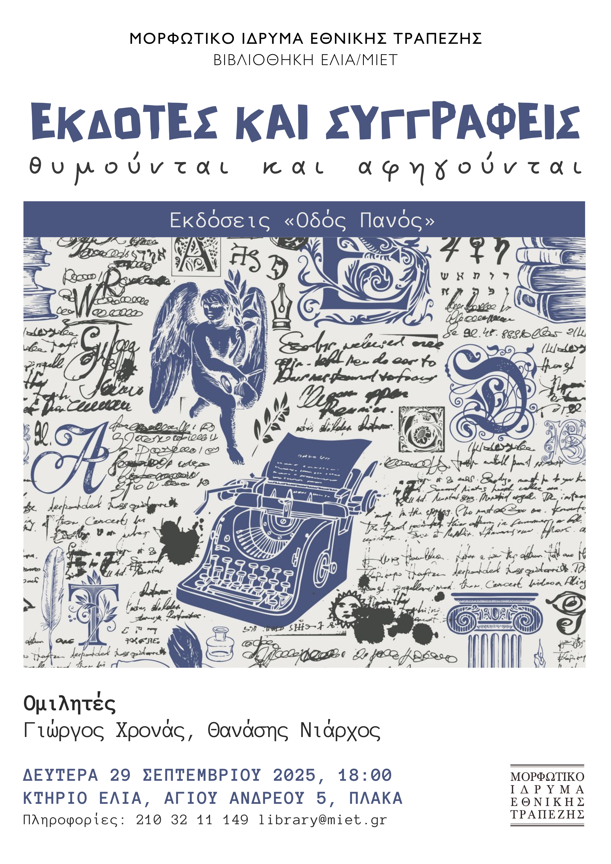 Τη Δευτέρα 17 Μαρτίου 2025 πραγματοποιήθηκε η πέμπτη συνάντηση του κύκλου συναντήσεων που διοργανώνει η Βιβλιοθήκη Ελληνικού Λογοτεχνικού και Ιστορικού Αρχείου του ΜΙΕΤ «Εκδότες και συγγραφείς θυμούνται και αφηγούνται». Η εκδήλωση ήταν αφιερωμένη στον Γιώργο Ιωάννου.