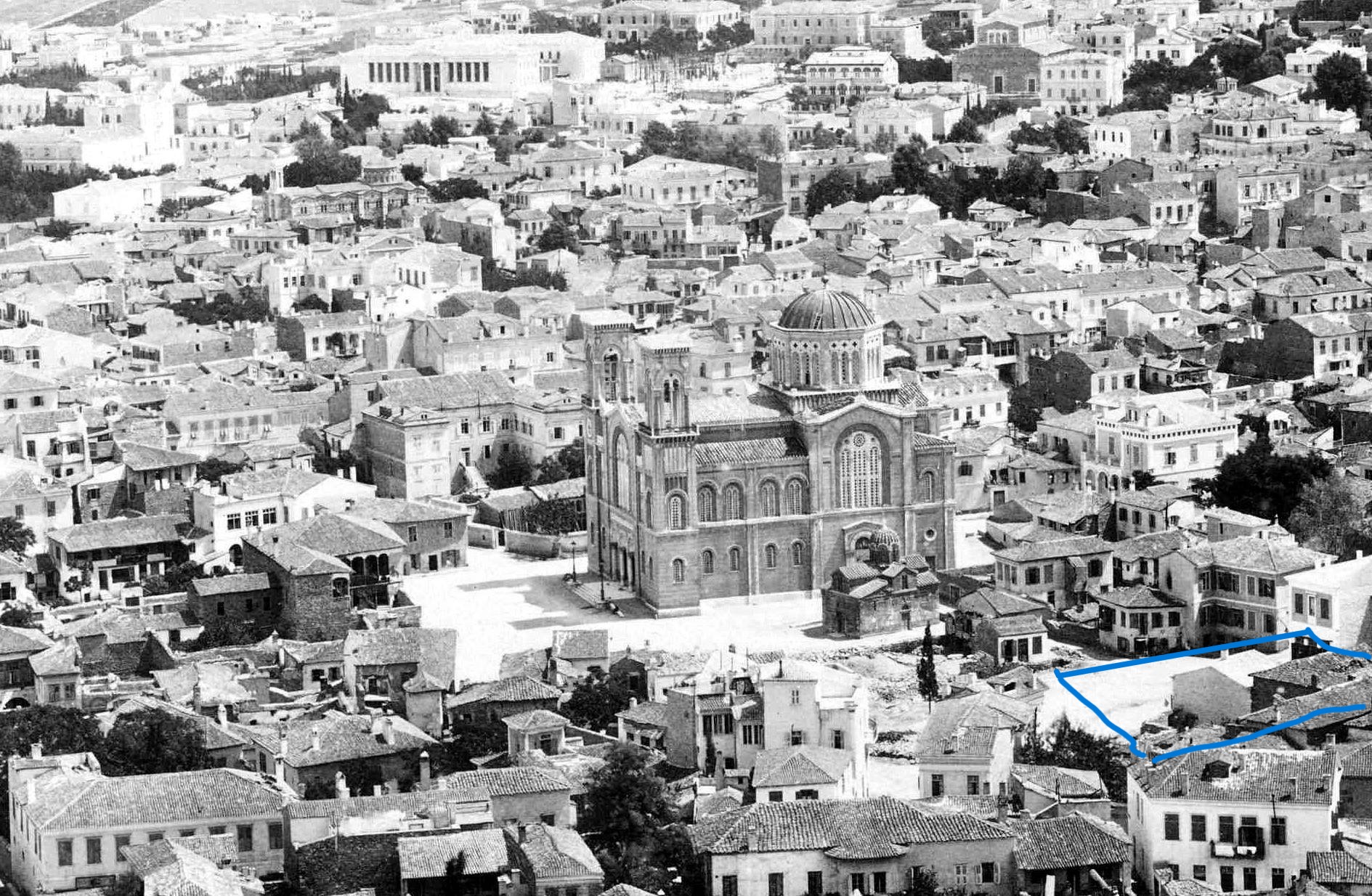 Η περιοχή που βρίσκεται το κτήριο του ΕΛΙΑ το 1880 περίπου σημειωμένη με μπλέ χρώμα. Πηγή: Η Αθήνα μέσα στο χρόνο (FB)