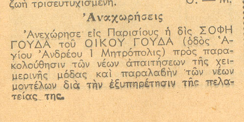 Ειδοποίηση στον τύπο για τον οίκο Γούδα.Πηγή: Θησαυρός, 17.9.1950, τ.616 σελ. 47.