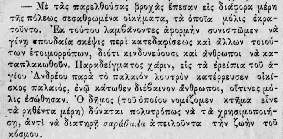 Στην παραπάνω καταχώρηση αναφέρεται ότι το 1882 στα ερείπια του Αγίου Ανδρέα κοντά στο Παλαιό Λουτρό κατέρρευσε παλιό σπίτι λόγω των βροχών. Πηγή: Νέα Εφημερίς 1.1.1882.