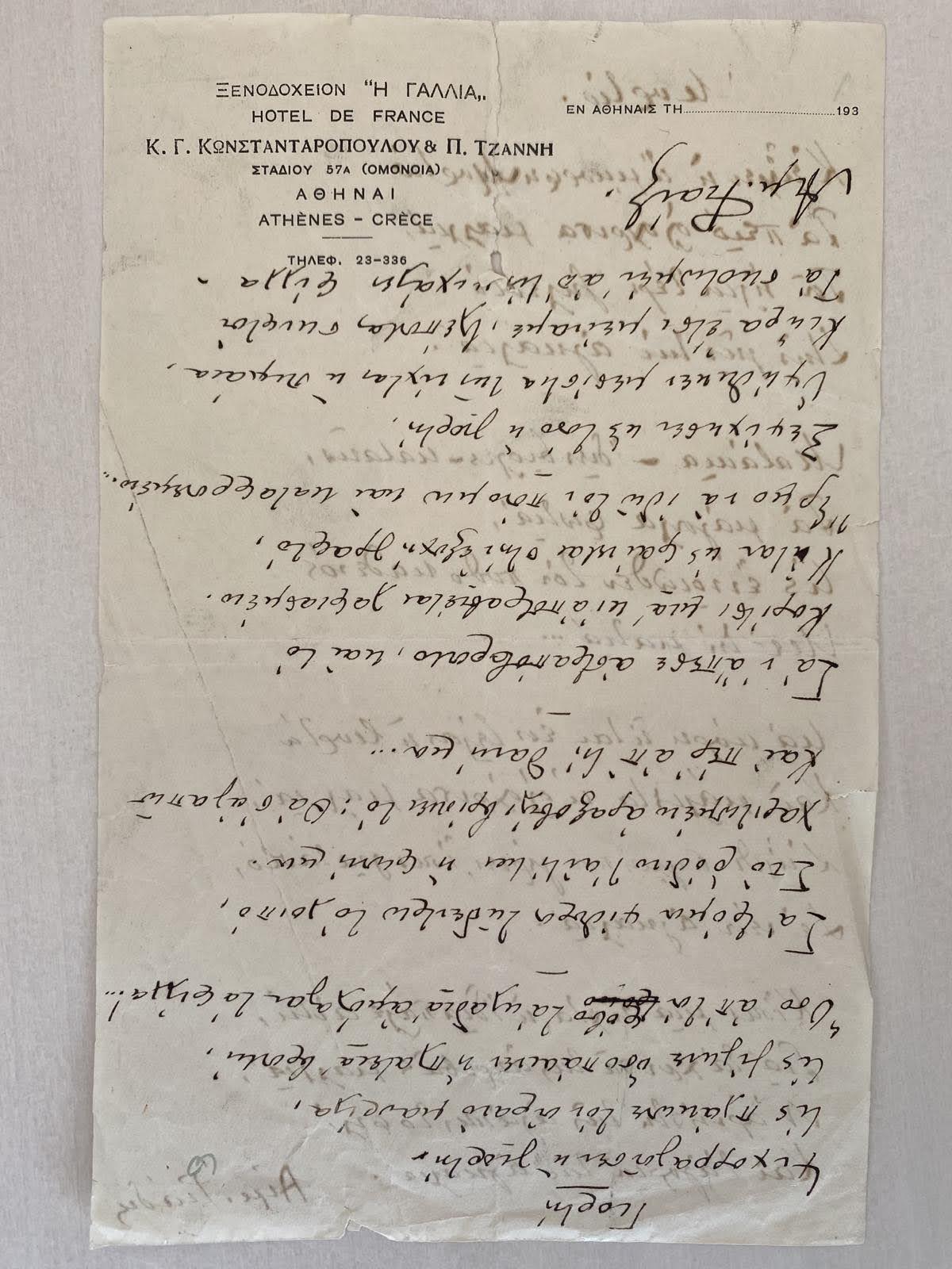 Φάκελος και επιστολόχαρτο του ξενοδοχείου «Γαλλία». Η επιστολή γράφτηκε γύρω στο 1933. Πηγή: Συλλογή Εφημέρων ΕΛΙΑ-ΜΙΕΤ (EPH.04.08.056, EPH.04.08.055)